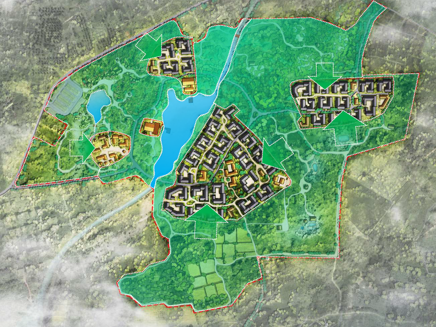 二、區(qū)域融合,激活地塊及周邊消極地塊。本案規(guī)劃設(shè)計(jì)中充分地利用了林地、水渠、農(nóng)田等區(qū)域用地,融入景觀、活動(dòng)等體驗(yàn)設(shè)計(jì)中。將原本消極的用地,通過(guò)整合設(shè)計(jì),形成有利的價(jià)值激活點(diǎn);突破原有思考界限,實(shí)現(xiàn)建筑景觀一體化。